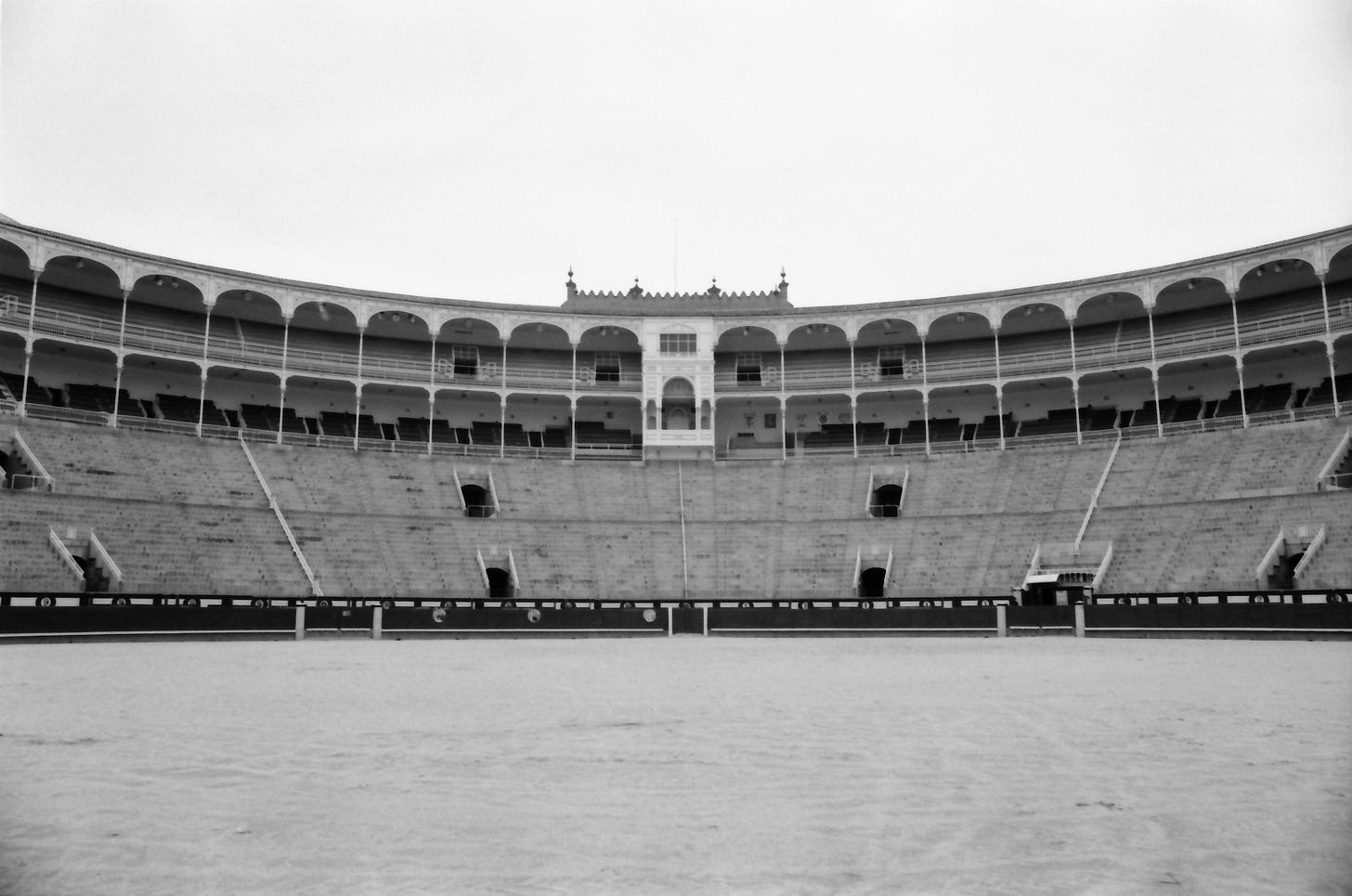 I pulled out my camera, making sure the wide lens was on, and adjusted my shutter speed and aperture for the dreary day. Eye to the finder, I checked my exposure and pulled focus to infinity. I lined up the shot, and clicked the shutter button. As if on cue of that first click, the drizzle faded away and I looked up just in time to see the father and the children disappear into the building. This was the moment I found myself entirely alone in the middle of one of the most famous bullrings in the world.